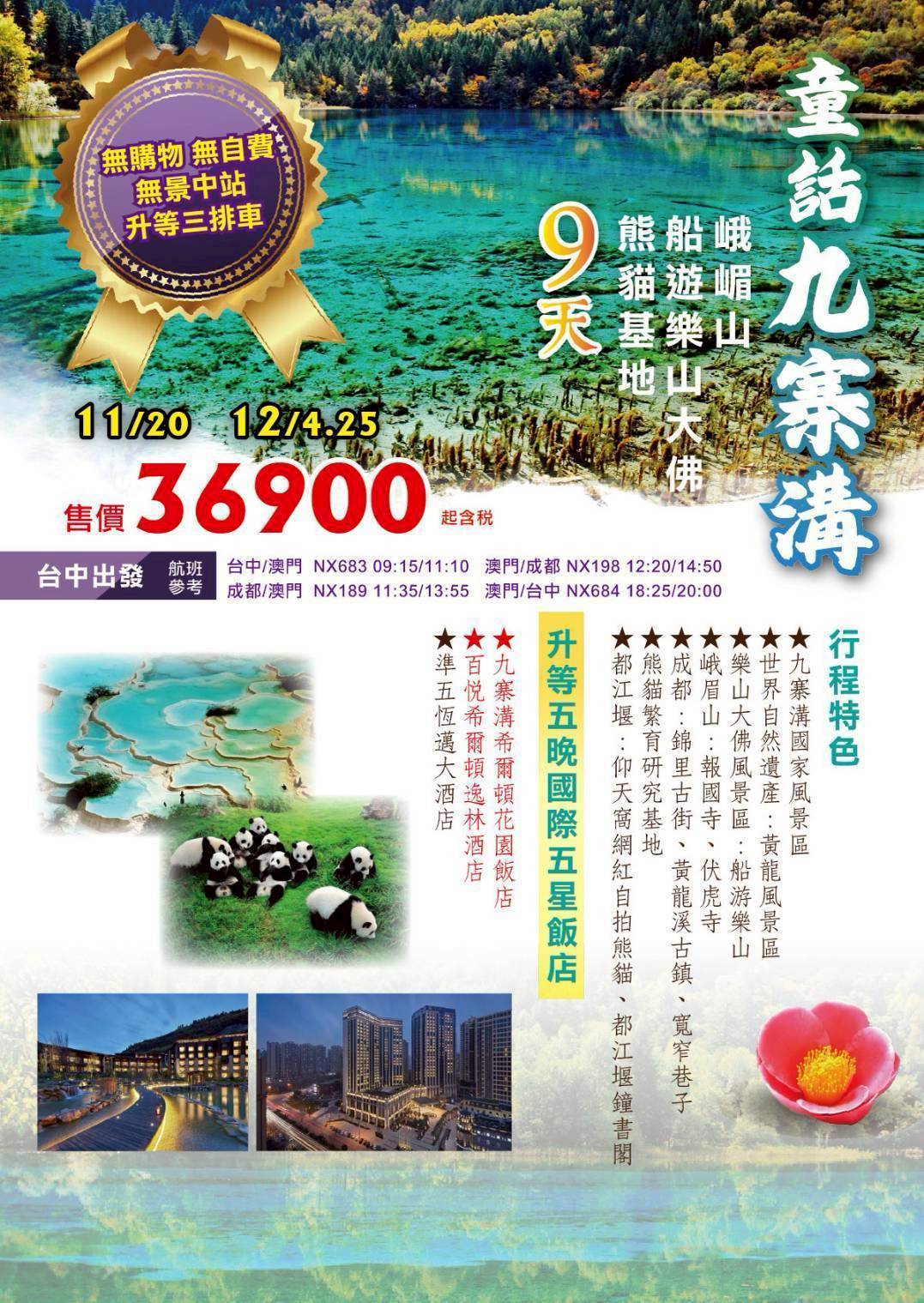 ✦ 童話九寨溝9天 ✦ 五彩黃龍、峨嵋山、樂山大佛、熊貓基地