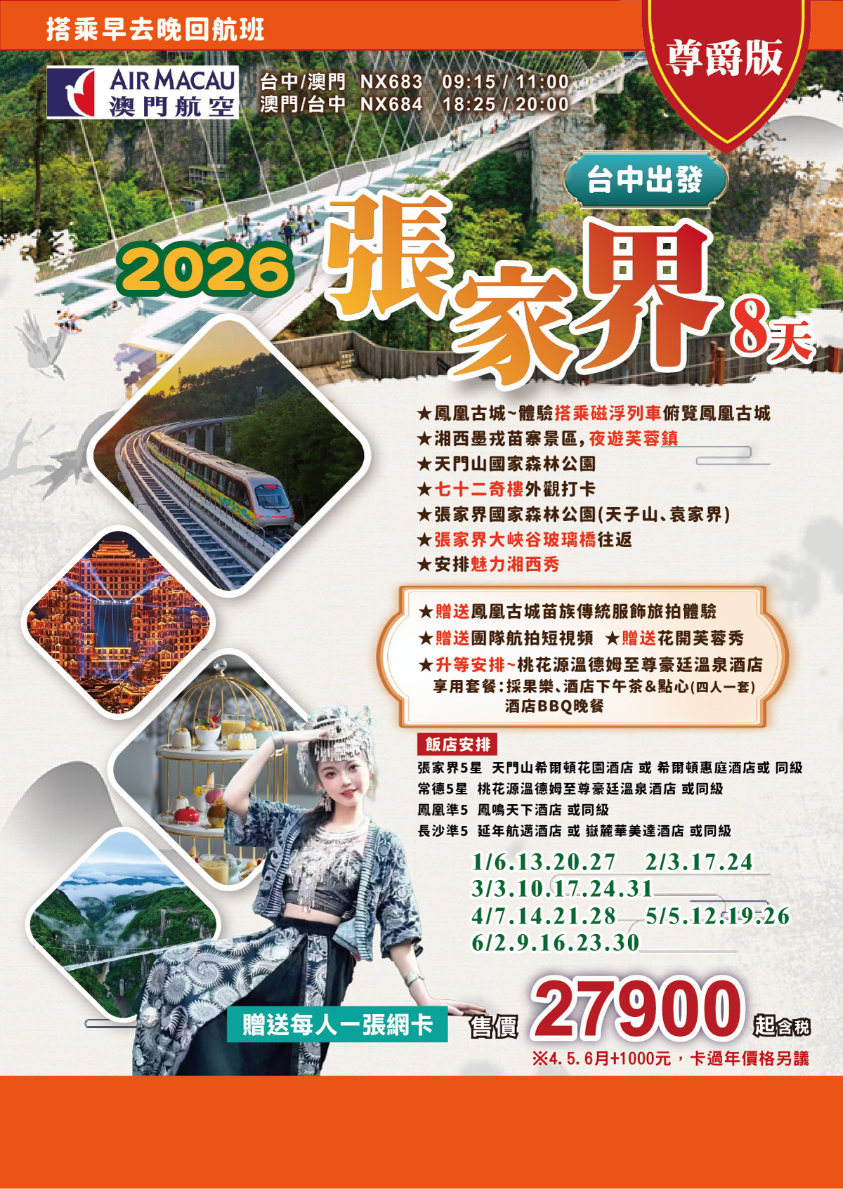 魅力張家界8天🥇(尊爵版)鳳凰古城.天門山景區.七十二奇樓. 魅力湘西秀