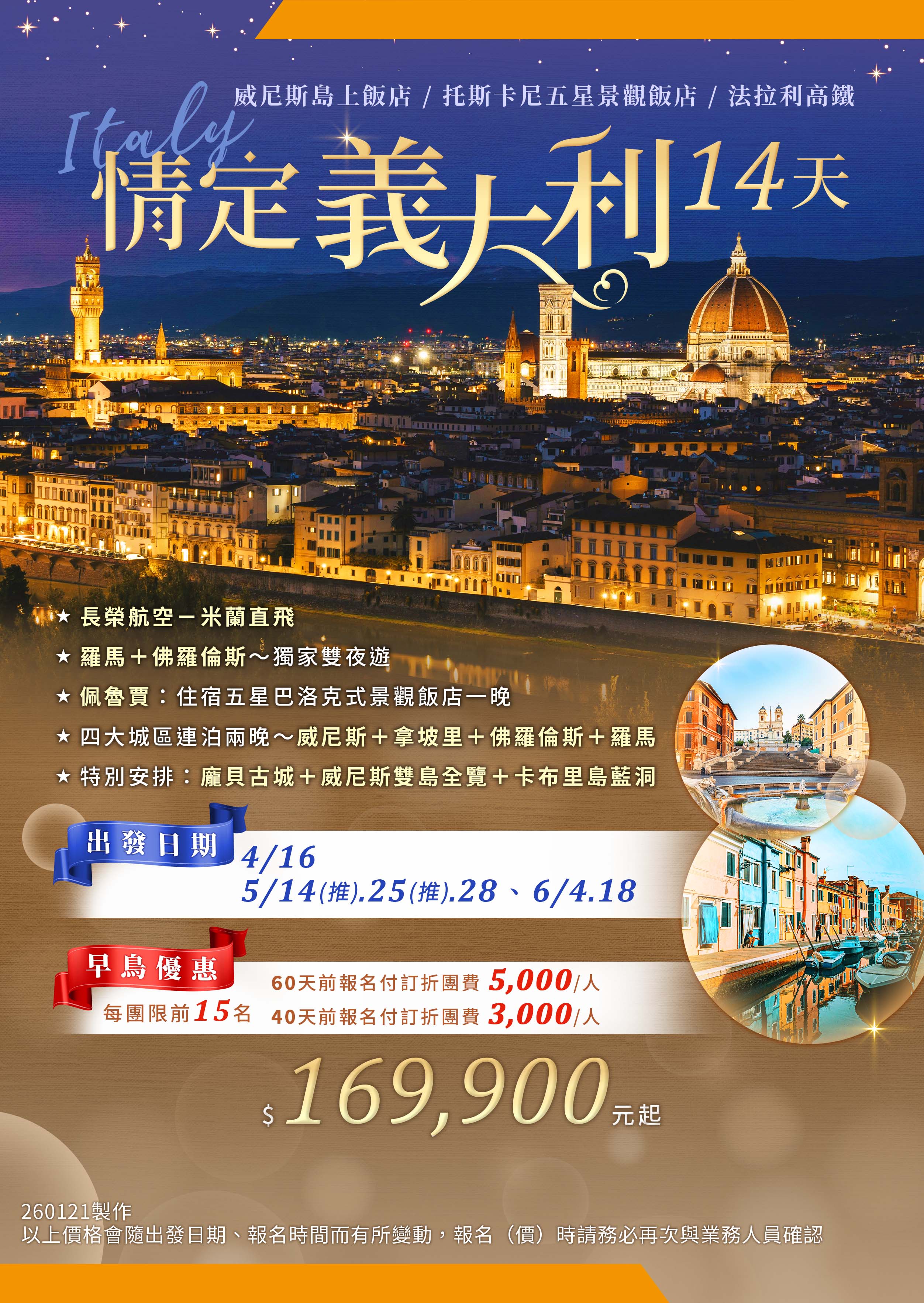 佛羅倫斯老城 🏛️、羅馬雙夜遊 🌙、拿坡里海岸 🌊、威尼斯雙島 🚤、卡布里島藍洞 💙、龐貝古城 🗿
